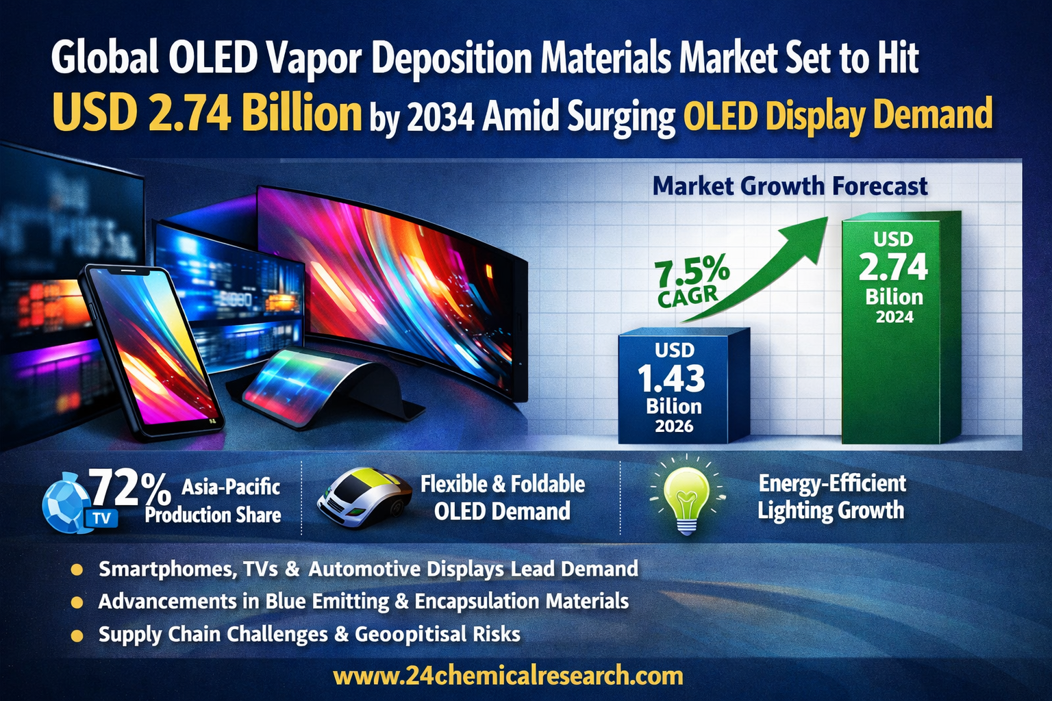 Global OLED Vapor Deposition Materials Market continues its strong expansion, with its valuation reaching USD 1.43 billion in 2026 according to the latest industry research. The market demonstrates remarkable growth potential, projected to expand at a CAGR of 7.5% through 2034, reaching approximately USD 2.74 billion. This sustained growth trajectory is primarily fueled by escalating demand for high-performance OLED displays across consumer electronics and the increasing adoption of energy-efficient lighting solutions.