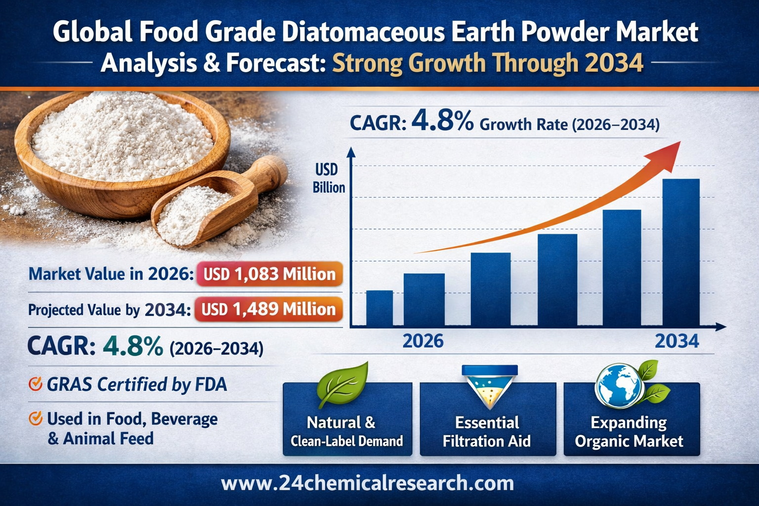 Global Food Grade Diatomaceous Earth Powder market was valued at USD 1,083 million in 2026 and is projected to reach USD 1,489 million by 2034, exhibiting a steady CAGR of 4.8% during the forecast period.