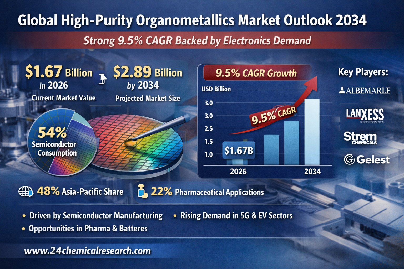 Global High-purity Organometallics market continues to demonstrate robust growth, with its valuation reaching USD 1.67 billion in 2026. According to the latest industry analysis, the market is projected to grow at a CAGR of 9.5%, reaching approximately USD 2.89 billion by 2034. This expansion is primarily fueled by increasing demand from the electronics sector, particularly semiconductor manufacturing, which accounts for over 54% of total consumption.