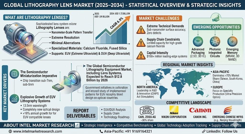 According to a new report from Intel Market Research, the global lithography lens market was valued at USD 1.09 billion in 2025 and is projected to reach USD 1.72 billion by 2034, growing at a CAGR of 6.9% during the forecast period (2025-2034). This growth trajectory reflects the critical role these precision optical components play in semiconductor fabrication and advanced packaging technologies.