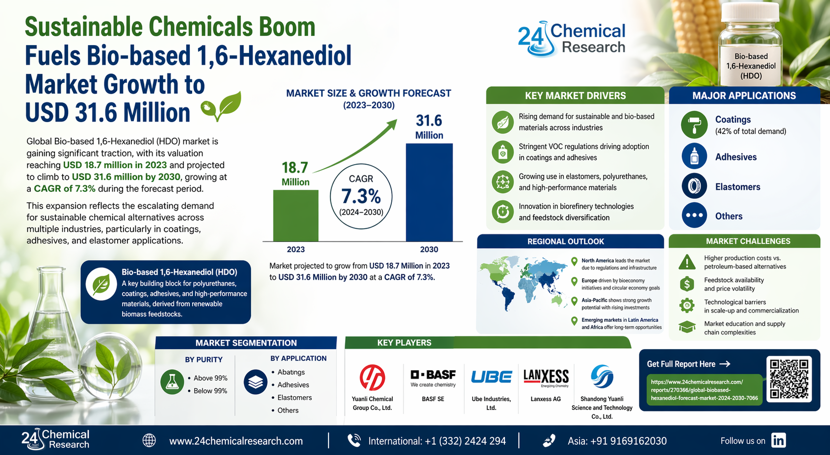 This comprehensive report provides detailed analysis of the Bio-based 1,6-Hexanediol market from 2024 through 2030. The research includes thorough examination of market dynamics, competitive landscape, and growth opportunities, with specific focus on: