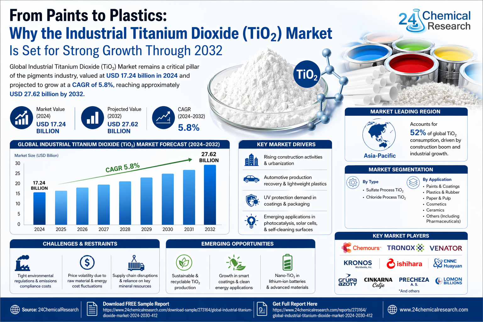 Global Industrial Titanium Dioxide (TiO₂) Market remains a critical pillar of the pigments industry, valued at USD 17.24 billion in 2024 and projected to grow at a CAGR of 5.8%, reaching approximately USD 27.62 billion by 2032. This inorganic compound, renowned for its brightness and ultra-high refractive index, continues to dominate applications in paints, coatings, plastics, and specialty chemicals. While the Asia-Pacific region leads consumption, sustainability innovations and strict environmental regulations reshape production landscapes globally.