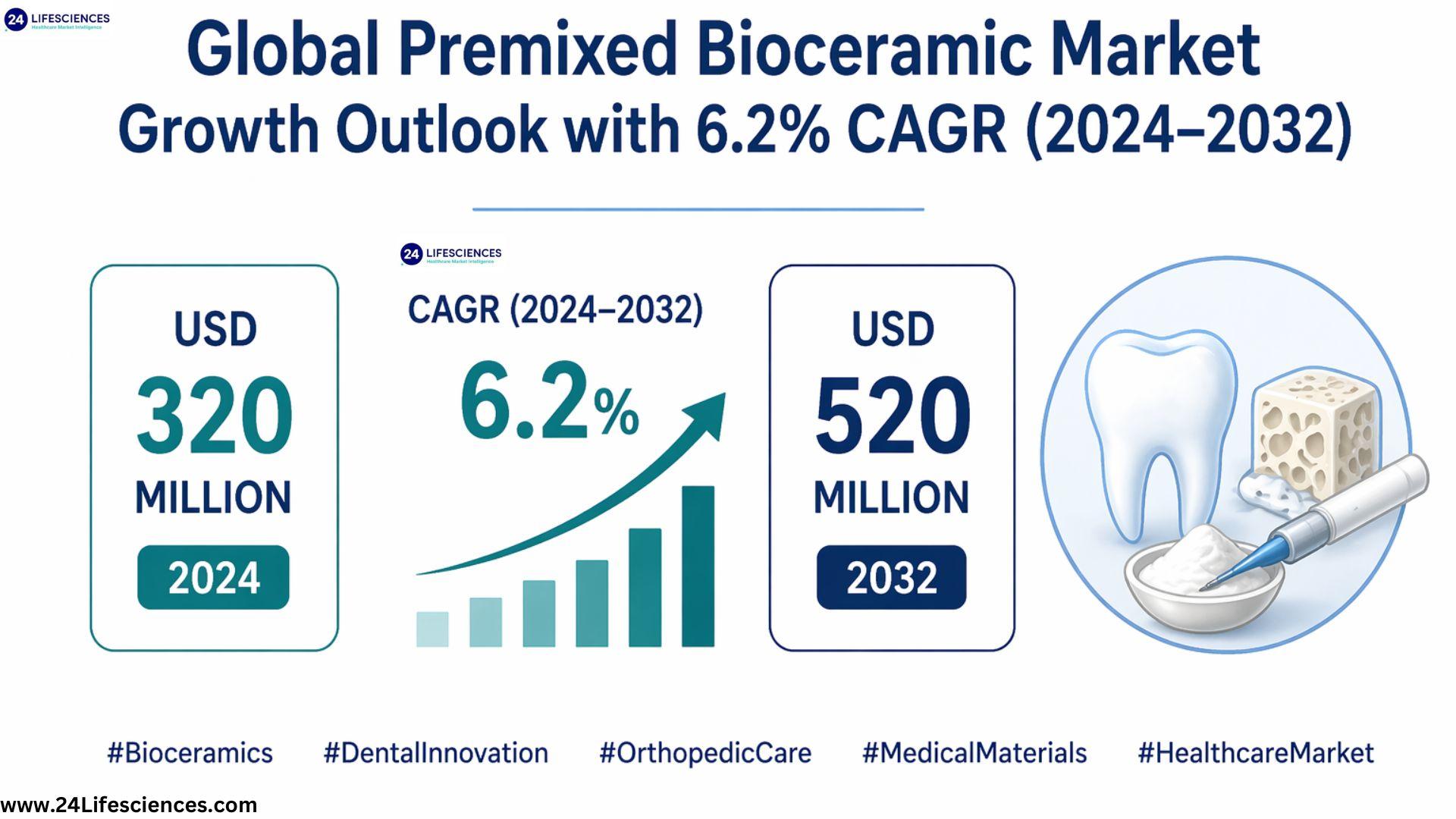 According to a newly published market research report by 24LifeSciences, global premixed bioceramic market was valued at USD 320 million in 2024 and is projected to reach USD 520 million by 2032, growing at a compound annual growth rate (CAGR) of 6.2% during the forecast period 2024–2032.
