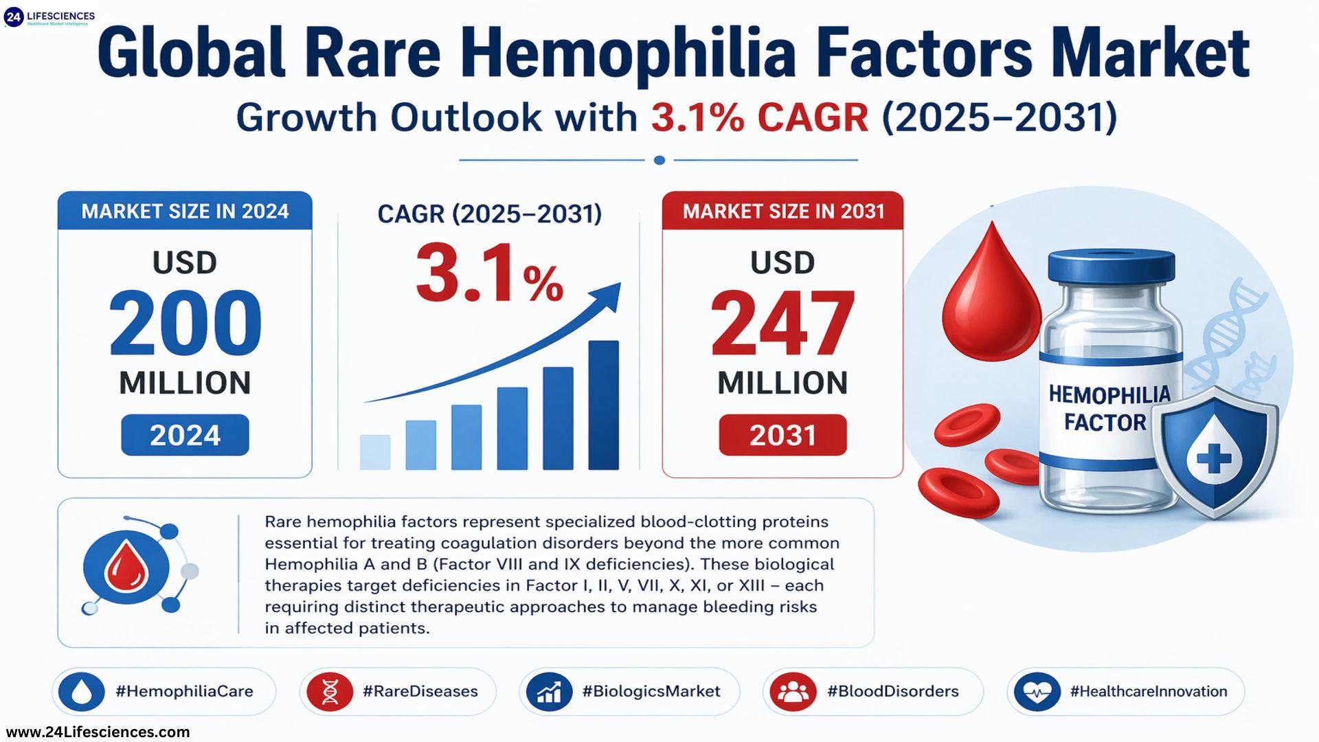 According to a newly published market research report by 24LifeSciencesglobal rare hemophilia factors market was valued at USD 200 million in 2024 and is projected to reach USD 247 million by 2031, growing at a compound annual growth rate (CAGR) of 3.1% during the forecast period 2025-2031.