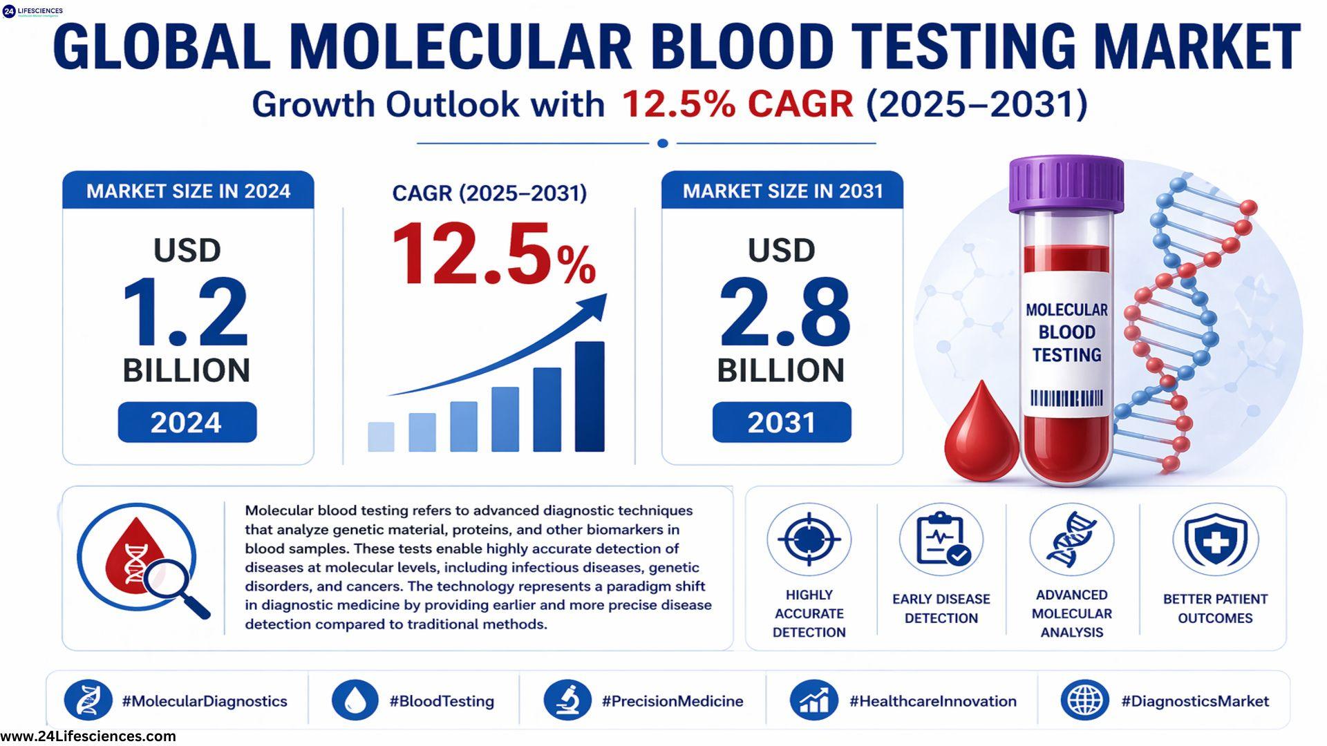 According to a newly published market research report by 24LifeSciencesglobal molecular blood market was valued at USD 1.2 billion in 2024 and is projected to reach USD 2.8 billion by 2031, growing at a compound annual growth rate (CAGR) of 12.5% during the forecast period 2025-2031.