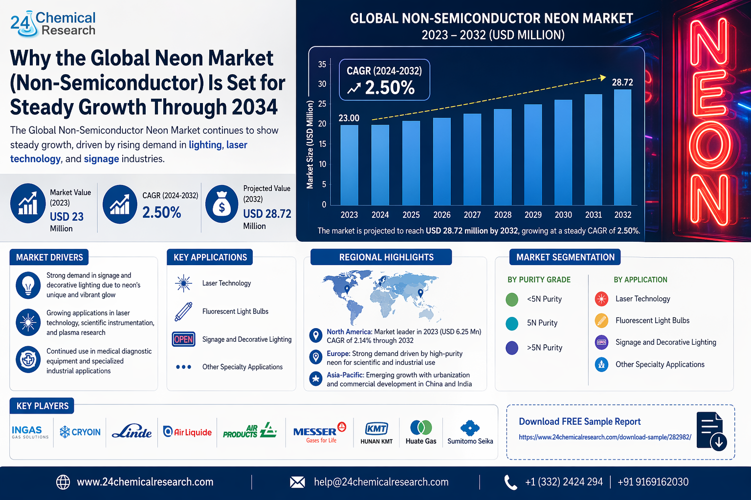 Global Non-Semiconductor Neon Market continues to demonstrate steady growth, with its valuation reaching USD 23 million in 2023. According to the latest industry analysis, the market is projected to grow at a CAGR of 2.50%, reaching approximately USD 28.72 million by 2032. This growth is primarily driven by increasing applications in lighting, laser technology, and signage industries, where neon's unique properties remain unmatched.