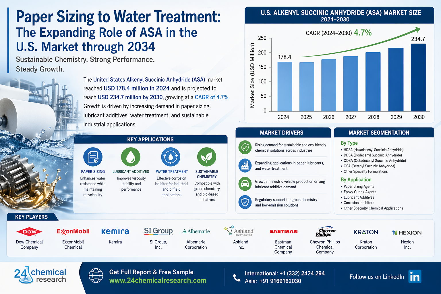 United States Alkenyl Succinic Anhydride (ASA) market continues to demonstrate steady growth, with its valuation reaching USD 178.4 million in 2024. According to the latest industry analysis, the market is projected to grow at a CAGR of 4.7%, reaching approximately USD 234.7 million by 2030. This growth is largely driven by expanding applications in paper sizing, lubricant additives, and water treatment, particularly in industries prioritizing sustainable chemistry solutions.