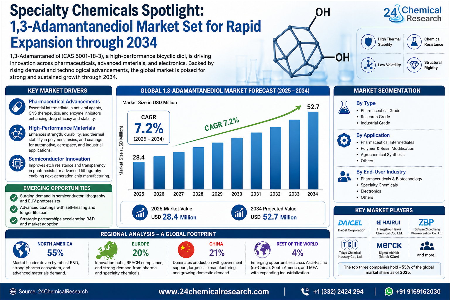 Global 1,3-Adamantanediol (CAS 5001-18-3) market was valued at USD 28.4 million in 2025 and is projected to reach USD 52.7 million by 2034, exhibiting a remarkable CAGR of 7.2% during the forecast period.