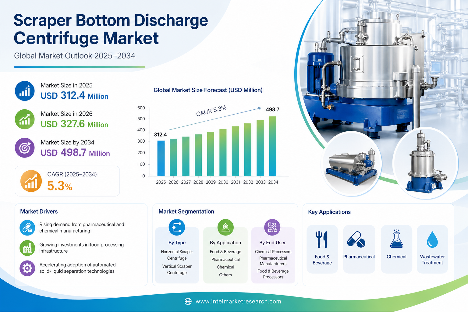 According to a new report from Intel Market Research, the global Scraper Bottom Discharge Centrifuge market was valued at USD 312.4 million in 2025 and is projected to grow from USD 327.6 million in 2026 to USD 498.7 million by 2034, exhibiting a CAGR of 5.3% during the forecast period (2025–2034). This steady expansion is driven by rising demand from pharmaceutical and chemical manufacturing sectors, growing investments in food processing infrastructure, and accelerating adoption of automated solid-liquid separation technologies across emerging economies.