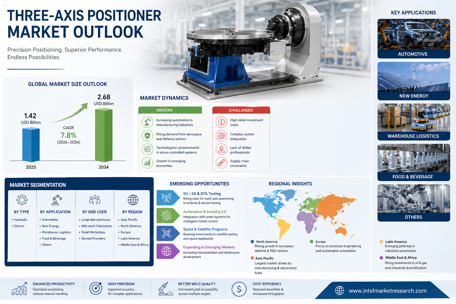 According to a new report from Intel Market Research, the global Three-Axis Positioner market was valued at USD 1.42 billion in 2025 and is projected to reach USD 2.68 billion by 2034, growing at a robust CAGR of 7.8% during the forecast period (2026–2034). This growth is propelled by increasing automation in manufacturing sectors like automotive and aerospace, technological advancements in servo-controlled systems, and rising demand from emerging economies.